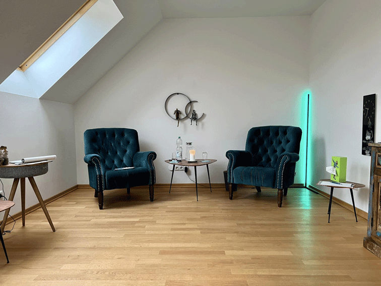 Im Beratungsraum gibt es drei Sessel und passende Tische,