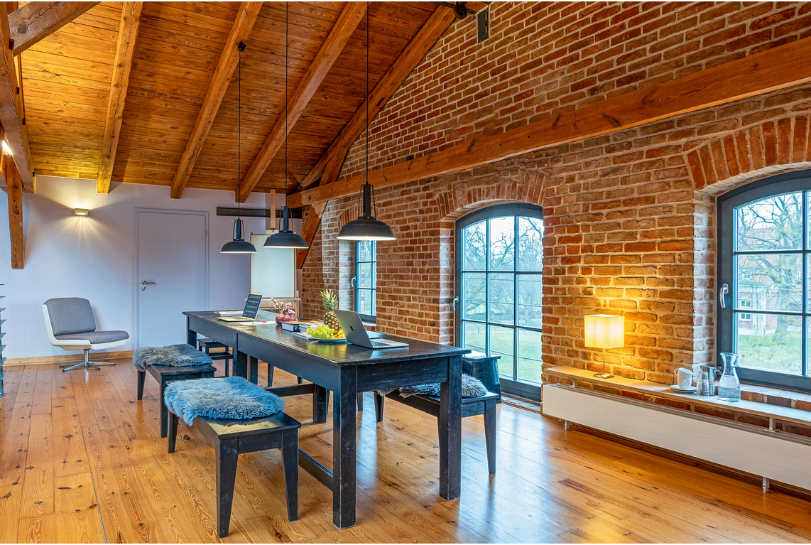 Ihr wohnt im “großen Speicher”, und wir arbeiten im fabelhaften “Loft”, sowie auch draußen auf den tollen Terassen oder im Garten.